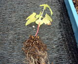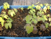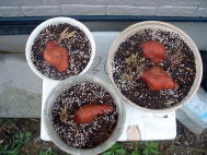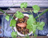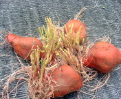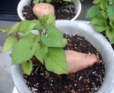 | 台木として使用するサツマイモをスーパーで購入し、芽出しのため植え付けました。上段写真は7月10日の様子。サツマイモの芽が十分伸びてきたので切り取りイモを堀上げ、栽培する鉢に植え込んだところです。 | |||