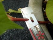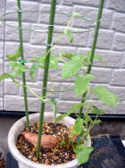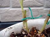 | 接ぎ木をするので、接ぎ木クリップを探したが見つからなかったので、接ぎ木テープで代用しようと思った。しかし、うまく巻けなかった(テープがすぐはがれてしまう)ので、テープの上から園芸用ワイヤーを巻いて穂木と台木を固定しました。(7月24日) | ![]() |