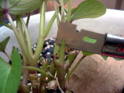 | 写真左側2枚は、8月15日の様子。支柱を立てました。右側2枚は8月19日の様子です。花のつぼみがいくつか見られます。 (やっと花が見られるのか?・・・) |