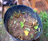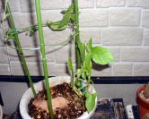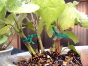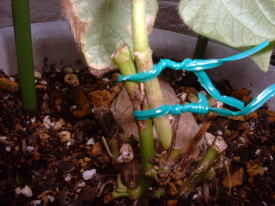 | 上段は8月11日の様子。(残ったアサガオ)左側写真中の奥の鉢はすべて枯れてしまった。右側写真は生育しているものの接合部分。(念のためワイヤーで固定している) | |||