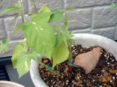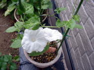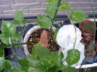 8月25日、やっと花を咲かせてくれました。白い花がとてもきれいです。ずいぶん昔に見て気になっていたサツマイモへの接ぎ木栽培が成功し、何となくささやかな「達成感」を感じました。 | |