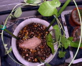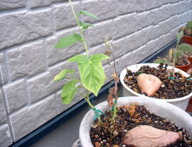 | ずいぶん昔になりますが、サツマイモにアサガオが接ぎ木されているものを見ました。サツマイモにアサガオを接いで栽培して、どんな効果があるのかはよくわかりませんがサツマイモから朝顔の花が咲いているのを見てびっくりした記憶があります。アサガオもサツマイモも同じヒルガオ科の植物ですので接ぎ木は大丈夫なのでしょう。「子どもに見せたらびっくりするかな」と思い自分でもやってみることにしました。 | |||