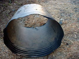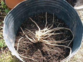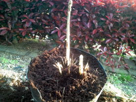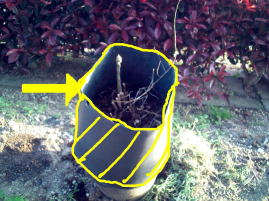 翌年の4月になり、芽が出始めました。 このまま茎を伸ばし収穫すれば普通のアスパラです。 ホワイトアスパラにするには、光を当てずに茎を伸ばさなければなりません。 そこで右写真のように、同じ大型ポットの底を切り取り準備をします。 |