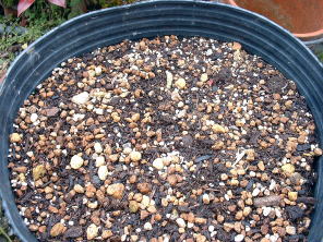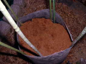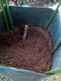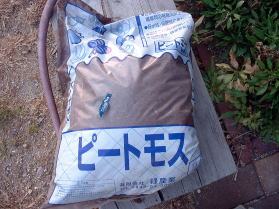 | 固定したポットにピートモスをいっぱいに入れます。(ピートモスでなくても良く普通の園芸用土でも良いのではないだろうか?モミガラなどでもいいかもしれない) ホワイトアスパラは、芽が見えたときに土を 掘って収穫する予定なので、柔らかく軽いピートモスが掘りやすく良いと思った。 |