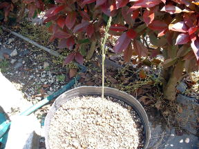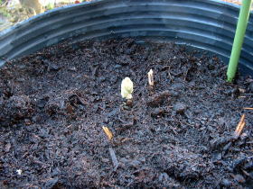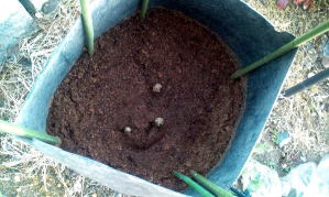 4月3日 大型ポットに植えつけました。 4月11日 早くも芽が出てきました。 |