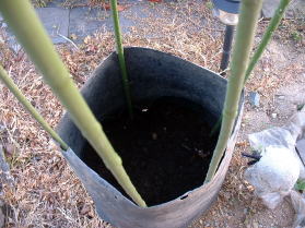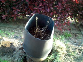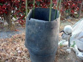 4.5 底を切り取った大型ポットを、栽培していたポットの上にかぶせ、ずれないように支柱をつかい固定します。 (左写真) |