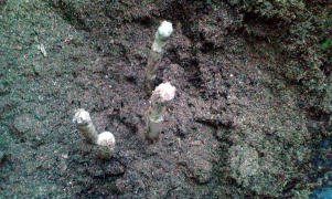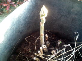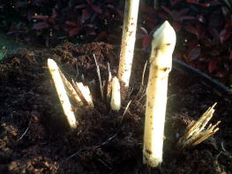 カバーをはずした後(上部写真左・中央)、土を少しずつ取り除いていくと、土の中に隠れていたアスパラが出てきました。(右写真→) 光に当たっていないので当然、白色です。 |