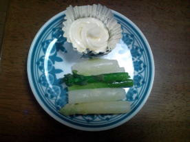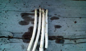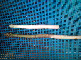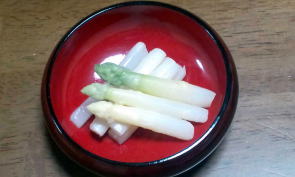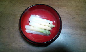 | 4月19日収穫。 芽が出てきたところで土を掘り、アスパラを収穫します。早速茹でて食べてみました。 光が当たった部分はやっぱり緑色になっています。採れたてはおいしいです。 |