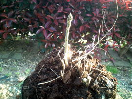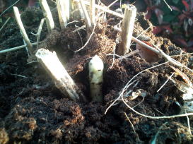| 4月12日 アスパラが出てきたので土を掘って収穫してみた。 写真では確認しにくいが、長く伸びてきたアスパラ以外にもう一本芽が出てきている。 光が当たっていた部分は緑色をしている。 |