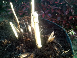 いくつか新たな芽も出てきました。 支柱をたて茎が倒れないように管理しました。 冬になると地上部は枯れてなくなります。 |