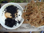 ケト土、富士砂、鹿沼土、ミズゴケを準備しました。 (本には赤玉土と書いてありましたが、鹿沼土しかなかったので代用しました。あと、くん炭もなかったので使用しませんでした。) |