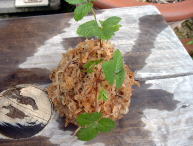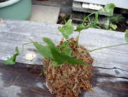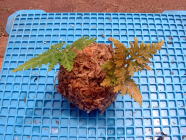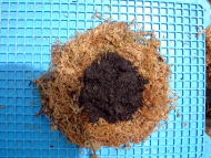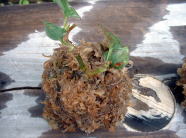 水ゴケの上に、混ぜ合わせた用土をのせ、その上に植物をのせ根を包むように水ゴケを球状にまとめる。おにぎりを握るような要領で握ると良いそうです。 |