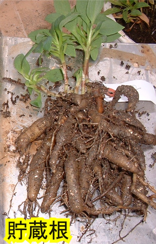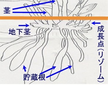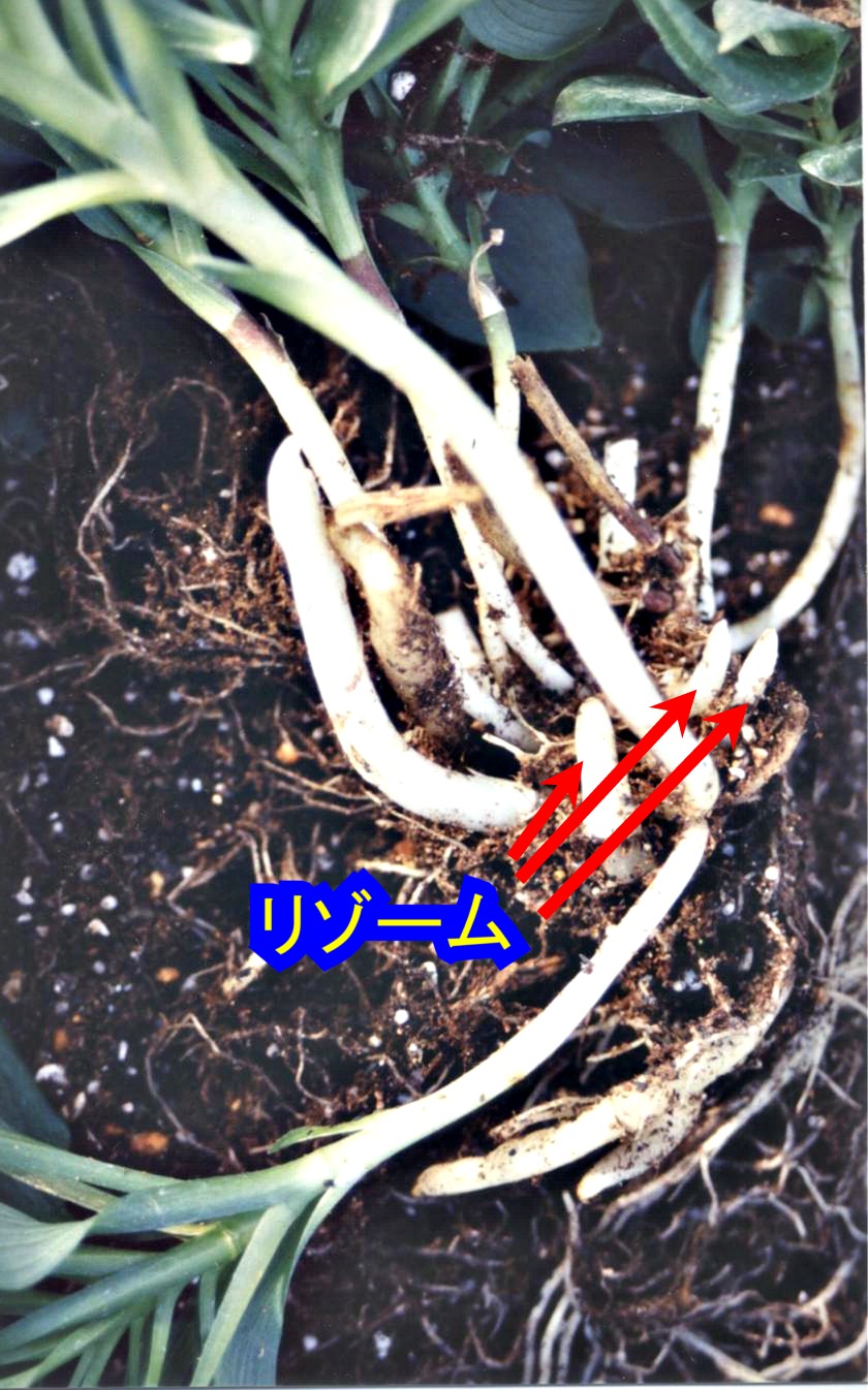 ![]() アルストロメリアの分解写真 リゾームが成長し、茎や葉、花を作る。リゾーム1つあれば、生育が可能。 |
