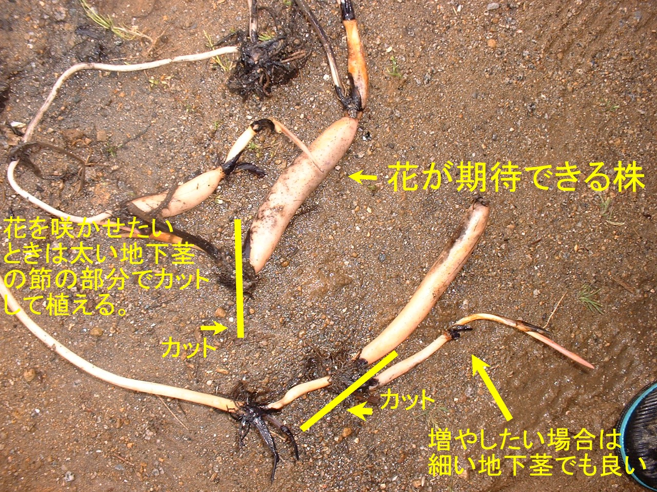 | ハス | 植え替えは地下茎が伸び出す前の時期が適期。 地下茎は節の部分で切る。蓮根を途中で切断すると、空洞に水が入り腐れやすくなる。 花を咲かせようとするなら、太い地下茎を植える。殖すだけであれば、一節でも可能。 植え付けは、地下茎が浮き上がらないように深めに植える。 ハスは、まず水の上に浮かぶ小さめの葉がでて、その後に大きな立葉が出てくる。 花の咲く確率は、大きな葉4枚につき1本程度。 |