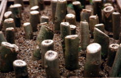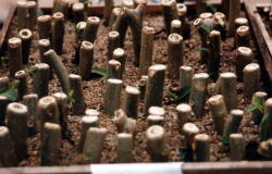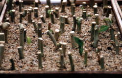 | もともと生育旺盛な植物ですが、挿し木を行う場合、挿し木の大きさ(太さ)によって発根の状況が違うのかちょっと調べてみました。(何年か前の調査です) 下の写真のように挿し木の直径が2.3cm以上のもの、1.5cm〜2.3cmのもの、1.5cm以下のものに分けて挿し木をしました。さし床は長い間雨ざらしにしてあった砂(海砂?)を利用。 11月下旬に挿し木しました。霜にあたらないよう、ビニールをかけた山野草ようのタナで管理しました |