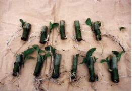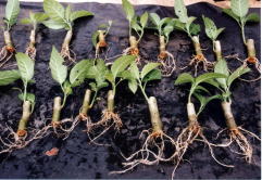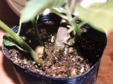 写真のように逆さまに挿し木をしても発根しました。 この苗をこのまま植えても新しく伸びた新芽から根が伸びだし、その根の生育が旺盛になり正常な生育に戻ろうとします。 |