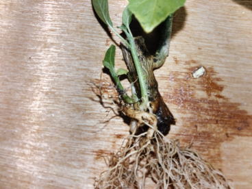 | 鉢から取り出して見てみると、新芽から根が沢山出ています。この新芽が、その後大きく成長していき、主茎となります。 そのため、逆さに挿して発根したものの、逆さまの茎のままでは大きく成長できませんでした。 |