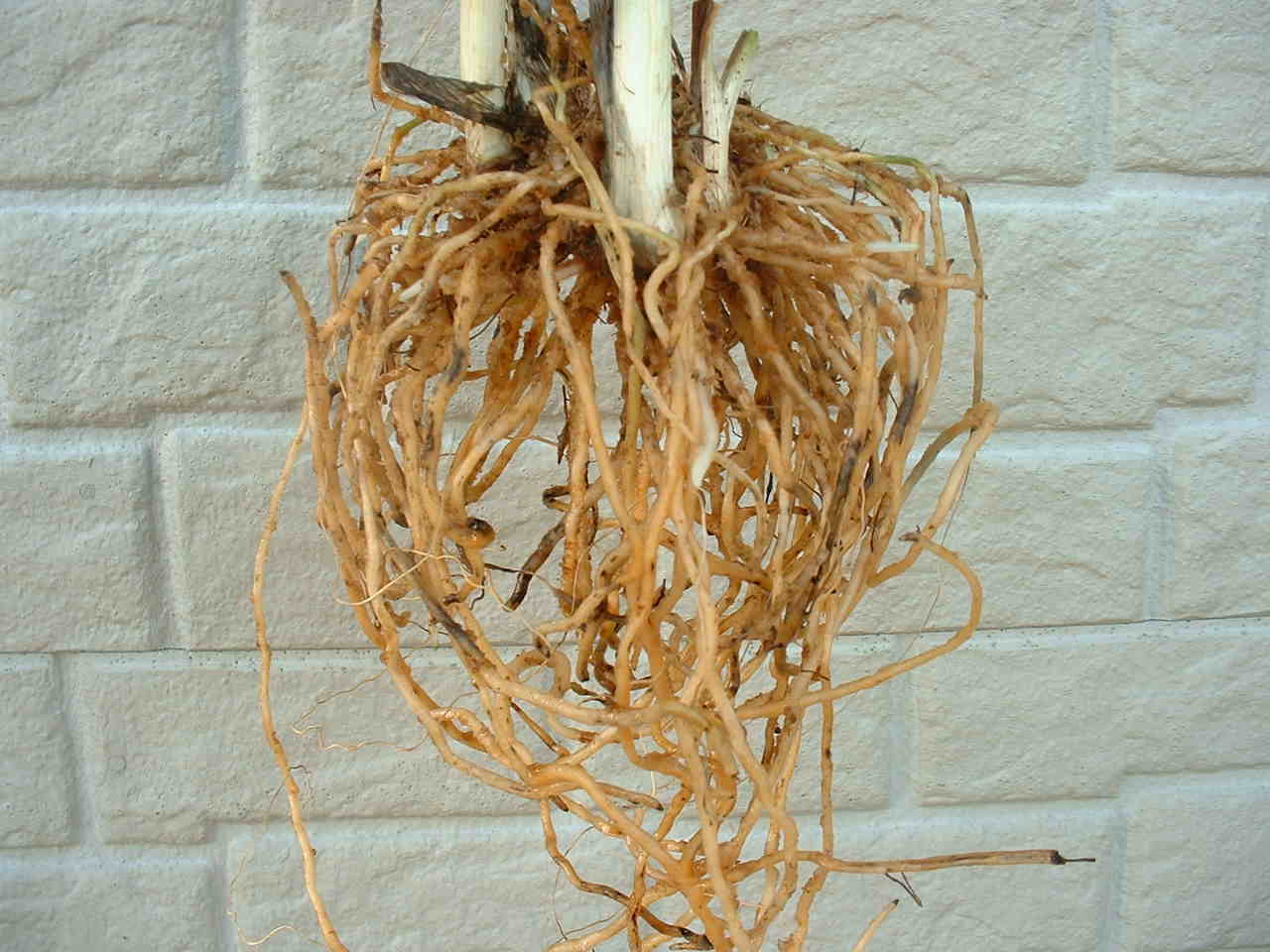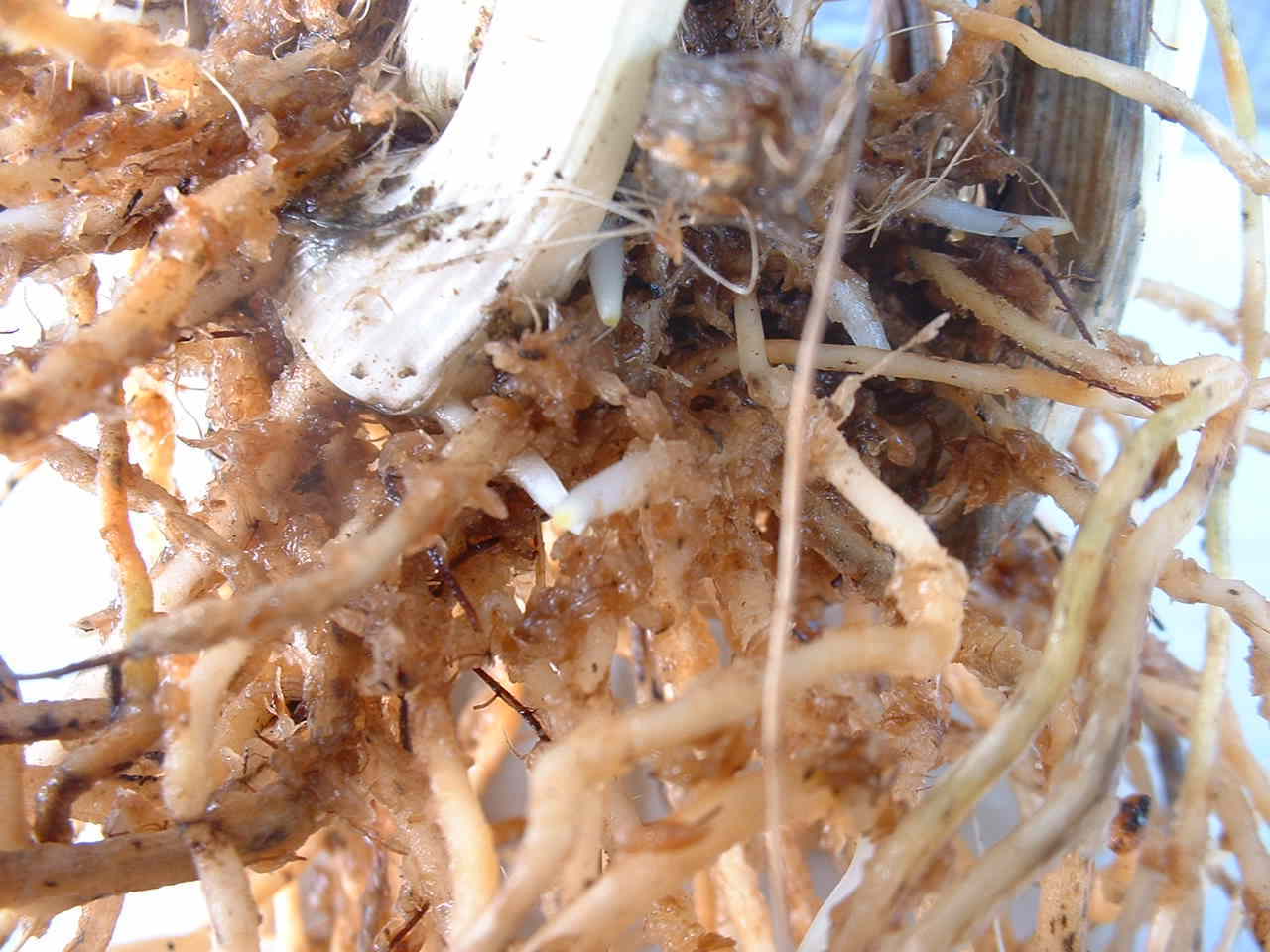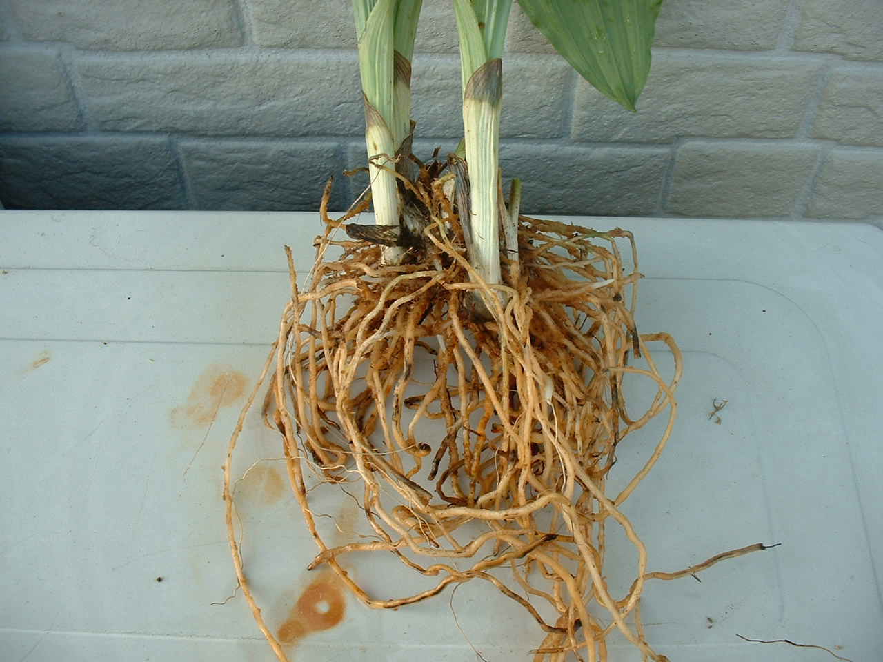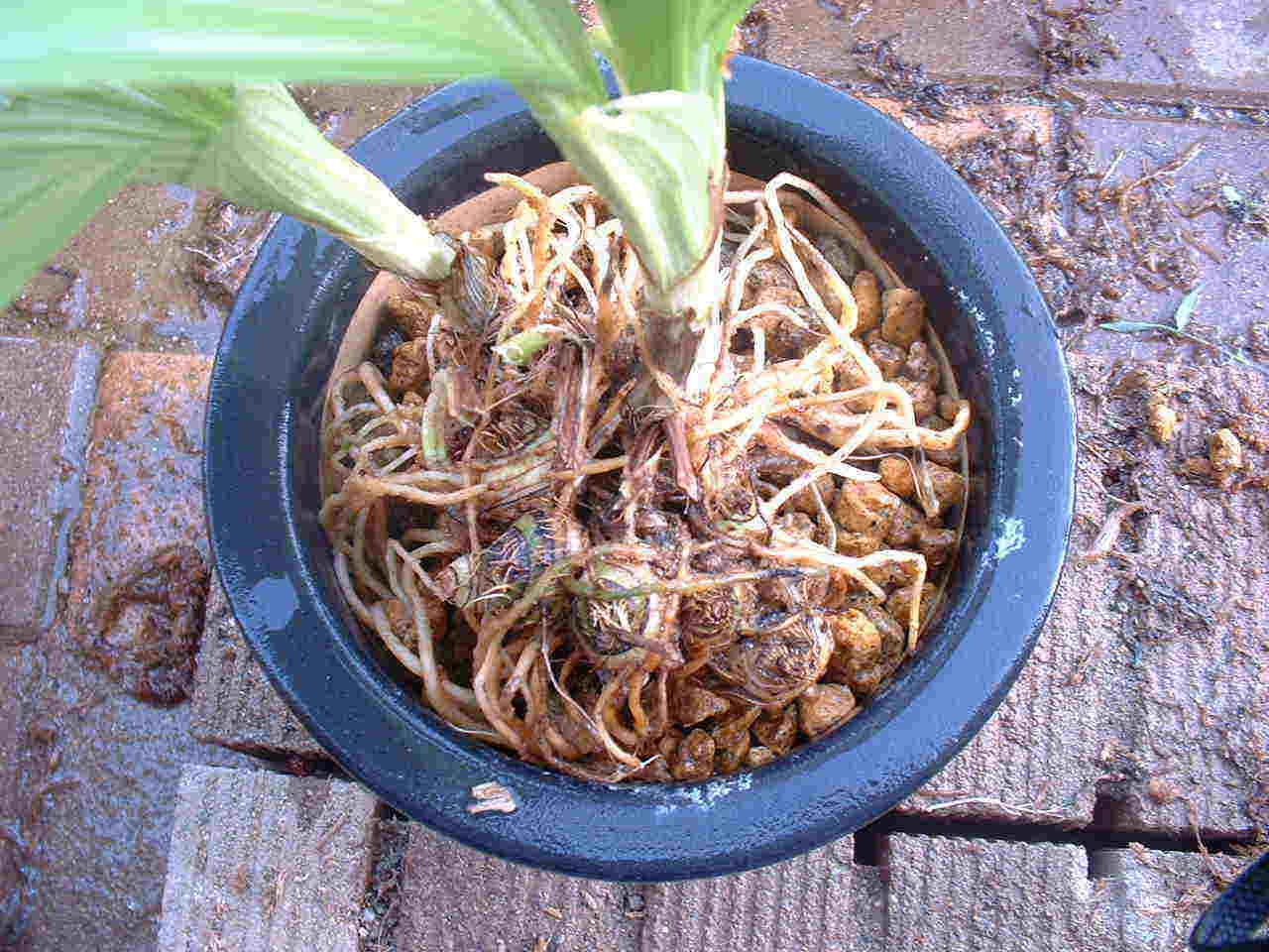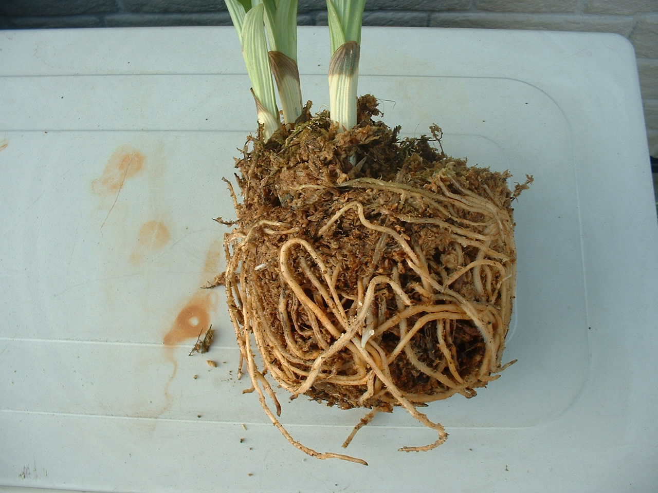 | 植えつけていた古い水苔を丁寧に取り除きます。今回このエビネの水苔を取り除いていた時、9匹のナメクジを発見しました水苔を取り除くとき写真右のような新しく伸びだした根を傷つけないよう充分注意をしました。 | ||