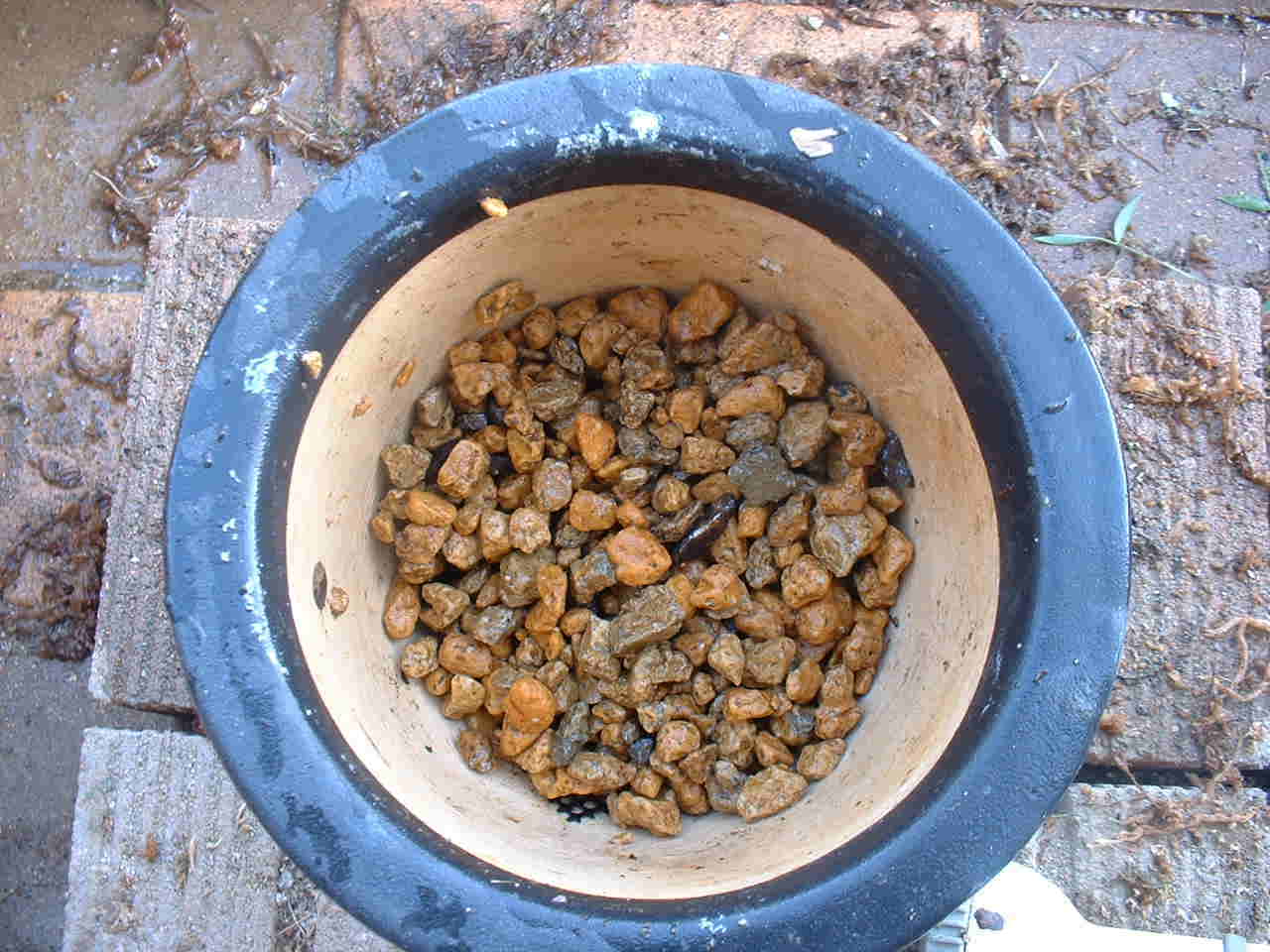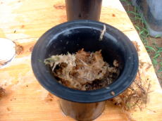 | 使用するボラ土はあらかじめ水で充分洗っておきます。今回使用したぼら土は中粒のボラ土を使用しました。(ホームセンターで売っているもの)植える鉢に1/3程度ボラ土を入れます(写真右側右端) エビネの根をひろげその中にボラ土が入るようにボラ土を入れていきます。その上に水苔を敷き詰めるようにまた、根に密着するように丁寧に水苔を入れていきます。(写真下) |