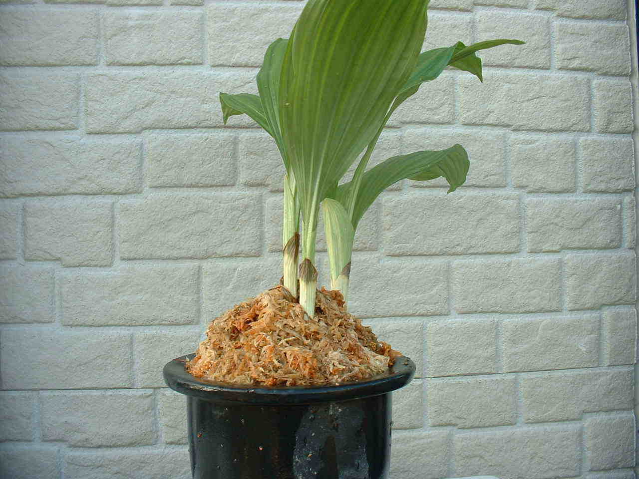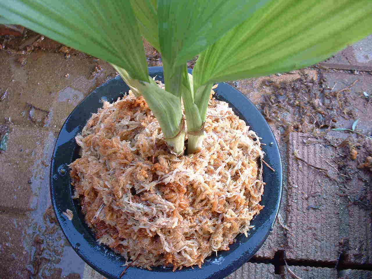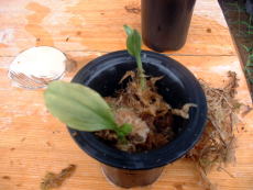 | 2.5号のビニールポットぐらいが良いと思いましたが、なかったので、ラン用のプラスッチクの鉢を利用しました。水苔を底に敷き詰めその植えに根を水苔でまいた苗を植え込みます。苗の周りに水苔を再度入れ植え込み終了。 |