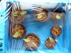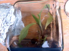 | 培養ビンの中で育てた植物は、ビンの外の環境条件(温度、湿度、光など)が違うので、植物が環境に適応できずそのまま外に出して育てようとしても枯れてしまう。 そこで、ビンの外の環境条件でも生育できるように少しづつならしていく作業が必要になる(順化)。鉢に植え込んだエビネを小さめのコンテナケースに入れラップで密閉しました。(湿度を保つため)また、この状態で温度の変化が少ない室内に置置くことにしました。(1〜2週間程度) |