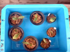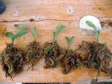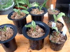 | 人工交配した種子を、無菌播種し発芽したものを植替え培養したもの。写真中央は、培養ビンからだし、培地の寒天を洗い流したもの。右側は培養ビンから出した苗に水苔をまいたもの。 | ||