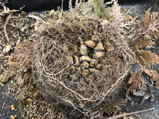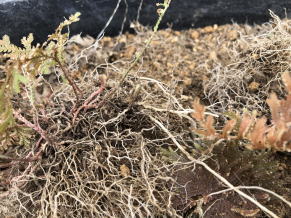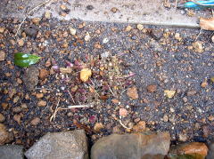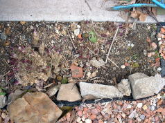 左側のギボウシは、地上部には何も見られませんでしたが根がぎっしりと回っています。 右側は、イワヒバが茂っていましたが、ギボウシの太めの根はあまりみられません。 |