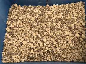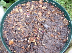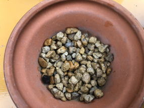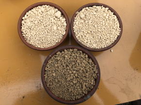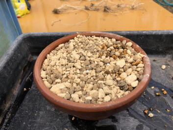 | 上の左画像は、鹿沼土2と赤玉土1の土。中央は鹿沼土と赤玉土を混ぜたもの。右画像は、鉢底にボラ土を敷いたところ。 | ||