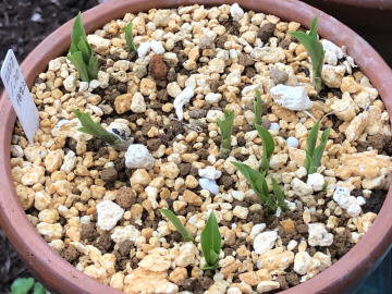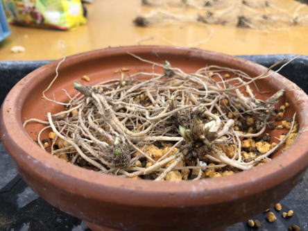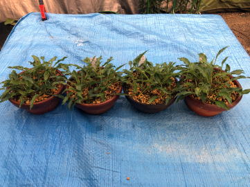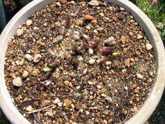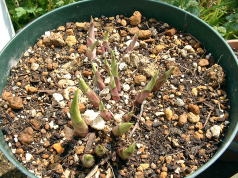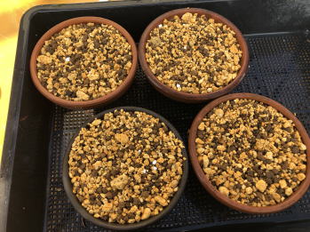 | 植え替える用土は、鹿沼土2、赤玉土1の割合で準備しました。鉢は前回と同じように5号平鉢4つに植えることにしました。芽は26個ほどあったので、一鉢に6、7 芽づつ植えることにしました。 | ||