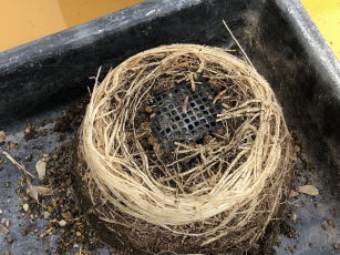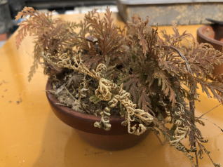 芽を確保するために、鉢土をバラしていきます。左は根がぎっしり回っているのでなかなかバラセマセン。 右はイワヒバの細い根ばかりなので鉢土がボロボロと崩れていきます。 |