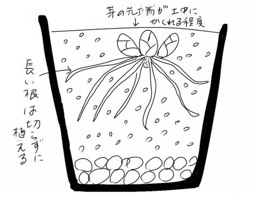 | 植えるのは下絵のように、芽の先端が土中に隠れる程度。長い根は切らない方が植え傷みが少ない。 | ||