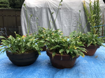 9月3日 花茎が伸びて、つぼみが膨らんでいます。水枯れのため、葉先が黄色くなっています。 |