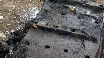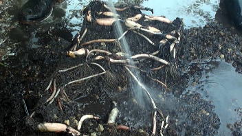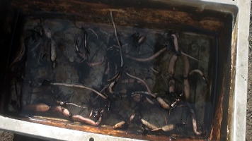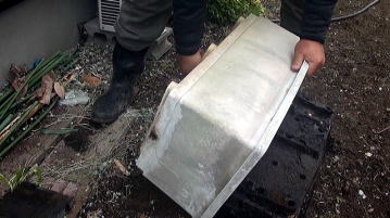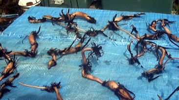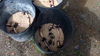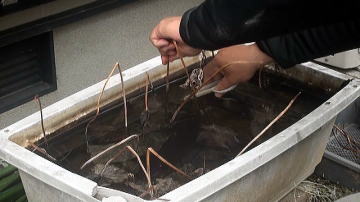 土から上の部分が枯れたハス。葉茎や葉などを取り除き、プランターをひっくり返してレンコンを掘り出します。レンコンは底にできるからひっくり返した方がレンコンを掘りやすい。ホースのジェット水流を利用し土を洗い流すと比較的楽です。レンコンを、可能な限り3節残して切り分けます。 |