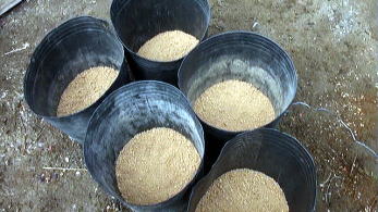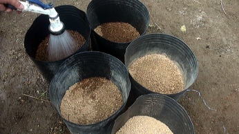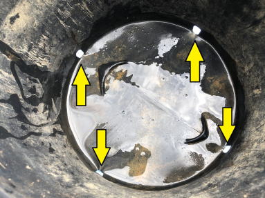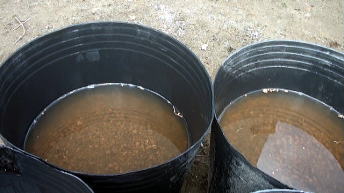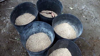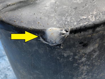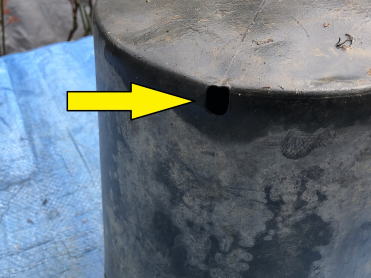 | 今回は、野菜の大型ポット栽培で使用している容器を使用することにしました。これには黄色い矢印のところに示しているように、水抜き用の穴があるので、バスシールを使用して水抜き穴をふさぎました。 |