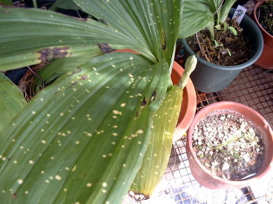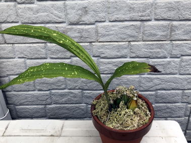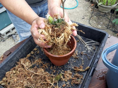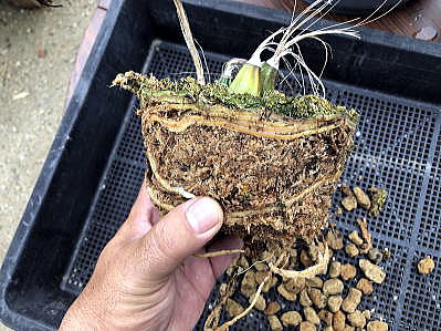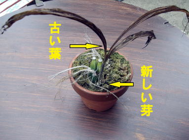 数年間植え替えをしていなかったホシケイランの葉が、枯れてきたので、観察をしてみるとバルブの近くから新しい芽が出始めていた。新芽が鉢の縁に近いこともあり、生育に悪影響を及ぼすといけないので思い切って植え替えることにした。 |