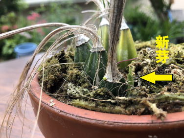 | 新芽が、鉢の縁ぎりぎりのところからでてきていた。 | 矢印の先が新芽部分。 | |||