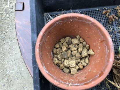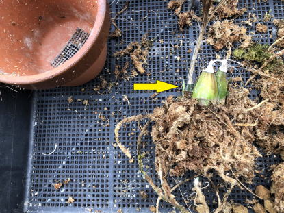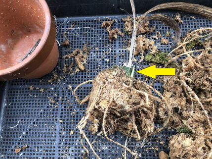 | 矢印部分は新芽。新芽があるほうに根が多く伸びていた。 | 新芽のある部分と反対側。根の量は少ない。根が見えるのは、新芽のほうから伸びてきているもの。 | |||