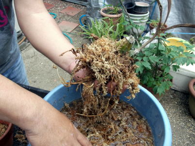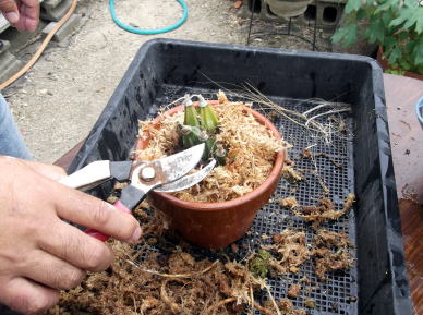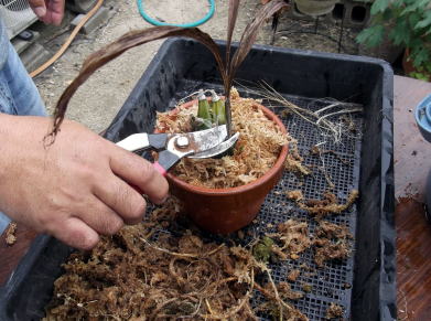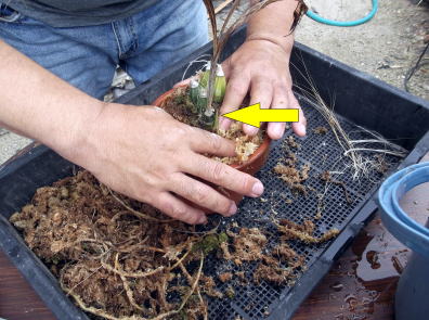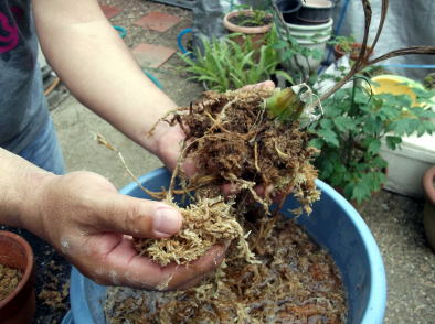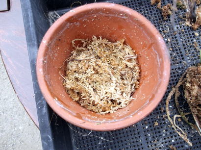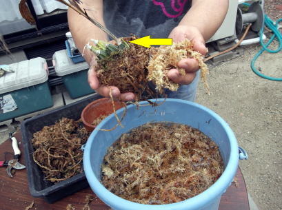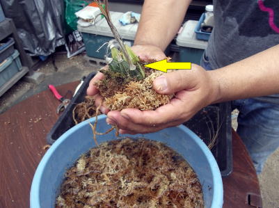 | 矢印は根の部分。古いミズゴケを全部取り除くと、根を痛める恐れがあるので、周りのミズゴケだけを替えることにした。 | 根の少ない部分はできるだけ多くのミズゴケを取り除くようにした。 | |||