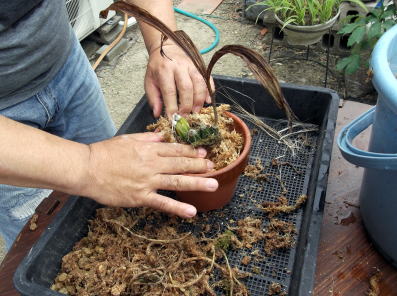 新芽と反対側にもミズゴケをかぶせていきます。 | 全体にミズゴケを巻いていきます。事前に根を巻いておき、その上にミズゴケをかぶせていきました。 | ||