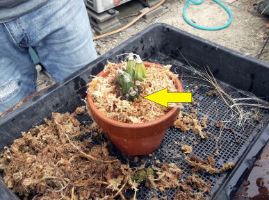 | 株の位置を確認しながらミズゴケを追加しながら鉢に植え付けていきます。 | 隙間にミズゴケを入れ込みながら植え付けます。 | 左画像と同じ作業。矢印先は新芽 | ||