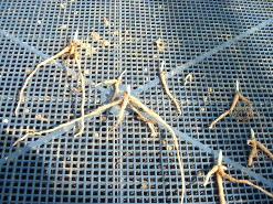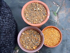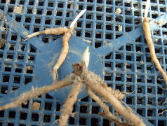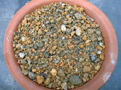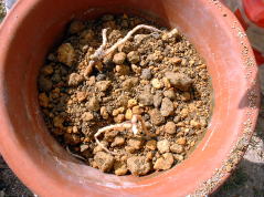 土佐ジョーロホトトギス、コハクホトトギスは、垂れ下がる性質があるので高さのある鉢に植え付けています。用土は桐生砂、鹿沼土の単用で植え付けました。根茎は、一つ一つが独立していて株には古い根が枯れた状態で残っているので全部取り除き植え付けました。 (2007年3月) |