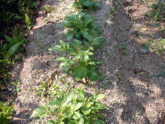 | 4月24日ジャガイモの土寄せを実行しました。上部左画像は土寄せ前の画像。上部中央は土寄せ前の株間に追肥をやったところです。上部写真右は、ジャガイモの株の両側から土を削って株元に土を寄せたところです。 これから収穫まで頑張ります。 |
