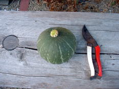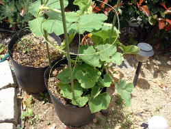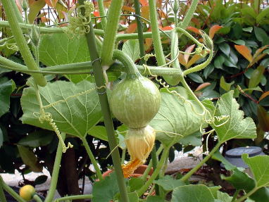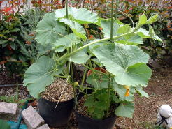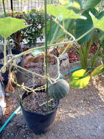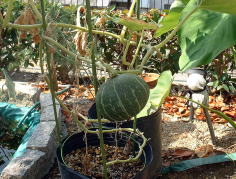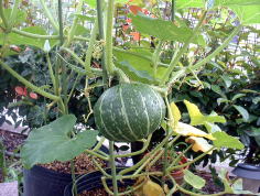 8月4日収穫しました。 左写真でわかるように、カボチャは小ぶりです。 ポット栽培のためか思うように大きくできませんでした。 しかしながら収穫できて満足! |