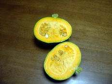 | 5月の連休明けにホームセンターでカボチャの苗を購入していましたが、植える場所がなくしばらく苗の状態で管理していました。苗が傷みはじめたので、5月下旬に大型ポットで栽培することにしました。6月12日頃には雌花が咲き始めていましたが、雄花が咲いておらず交配することができませんでした。6月17日別の雌花が咲いたので、咲きかけていた雄花のおしべを無理矢理取り出し交配しました。 | ||