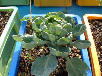 芽キャベツの生育は、ブロッコリー同様大きくなりませんでした。100円ショップのコンテナ栽培には向いてないようです。 |