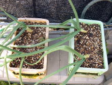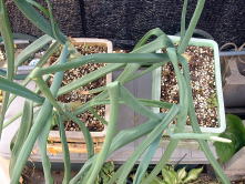 露地栽培と同じように、4月に入りずいぶん大きくなってきました。収穫まではもう少しです。 どのくらいたまねぎが肥大するのか楽しみです。 |