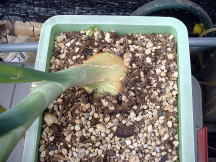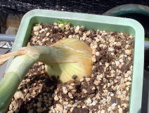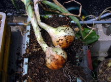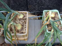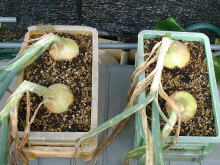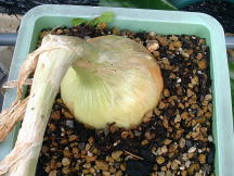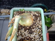 5月15日たまねぎの肥大の様子です。 写真ではわかりにくいかもしれませんが少し大きくなっています。 5月に入って肥大がすすんでいるようです。 |