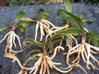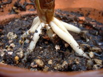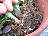 | 水苔で植えていたので、根に着いた水苔を洗い流します。(写真左) 鉢に鉢底の土を入れたあと市販のクンシラン用培養土で苗を植え込みました。 | ||