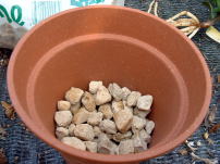 植え込むときは、根を広げて根の間に培養土がしっかり入り込むように植え込みます。植え込んだ鉢の上部には、見栄えが良いので(勝手に自分で思いこんだ)オモトに使った使用済みの培養土を置きました。 |