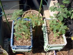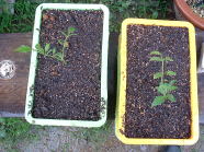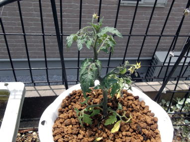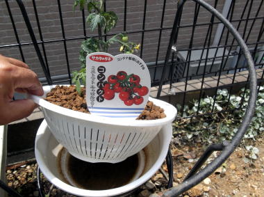 | 4月25日、購入したミニトマトの苗を赤玉土だけでザルに植えました。ミニトマトは、茎があまり伸びないコンパクトな品種を選びました。(実際に植えたのは色違いのものです) | ||